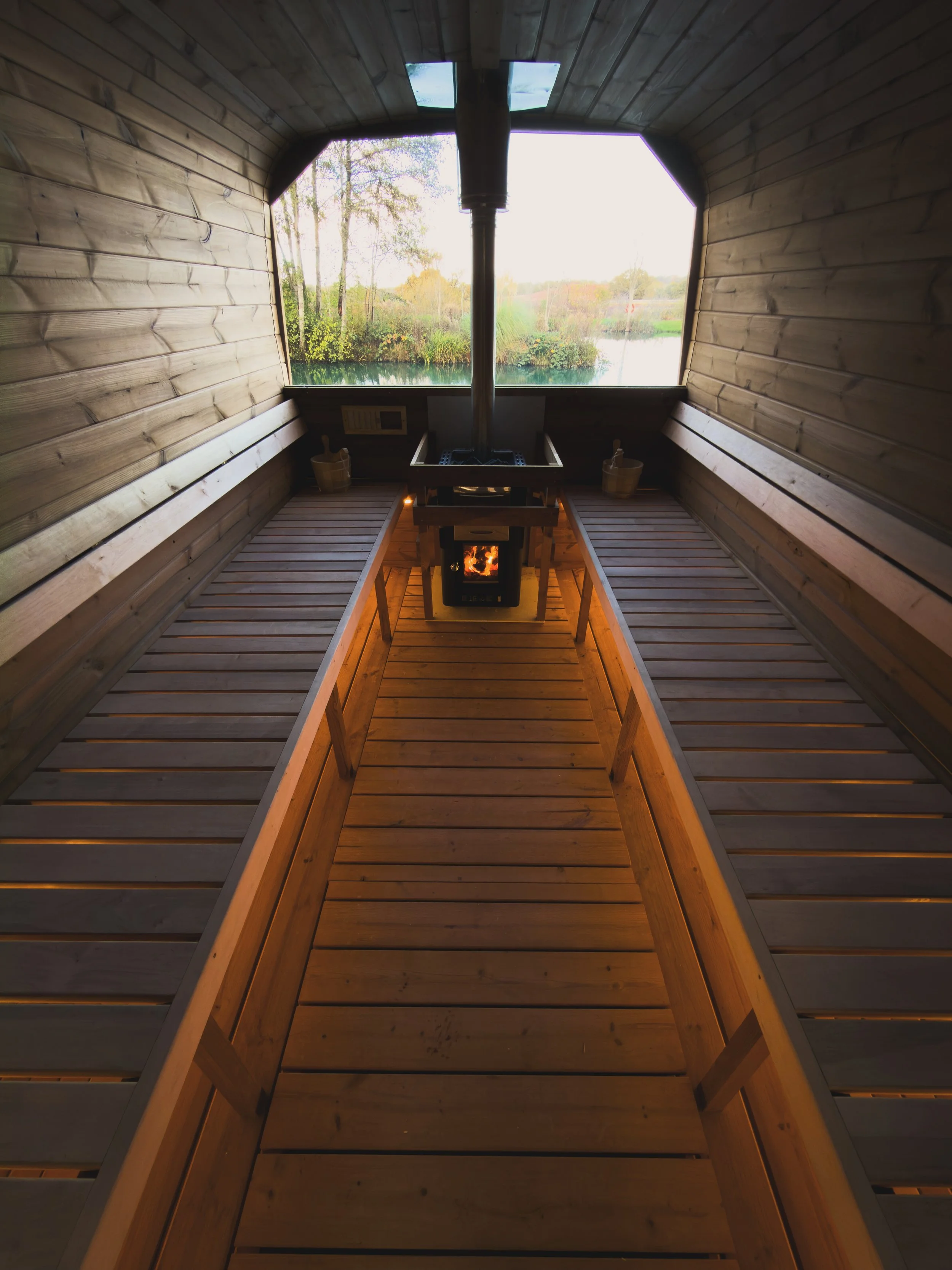 Our two 4-metre wood-fired saunas, offer authentic heat and lakeside views.